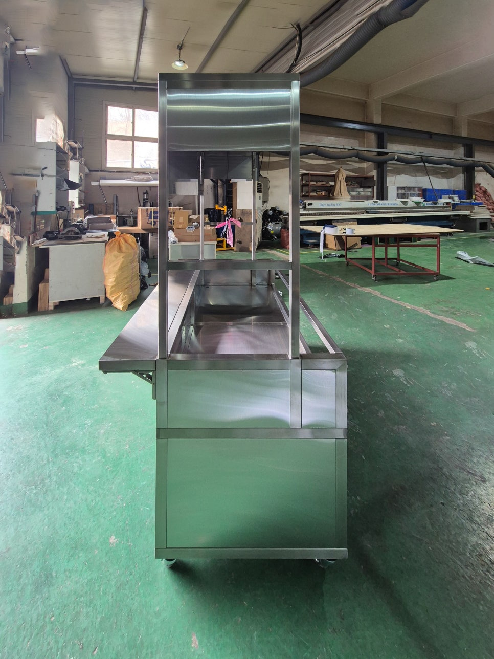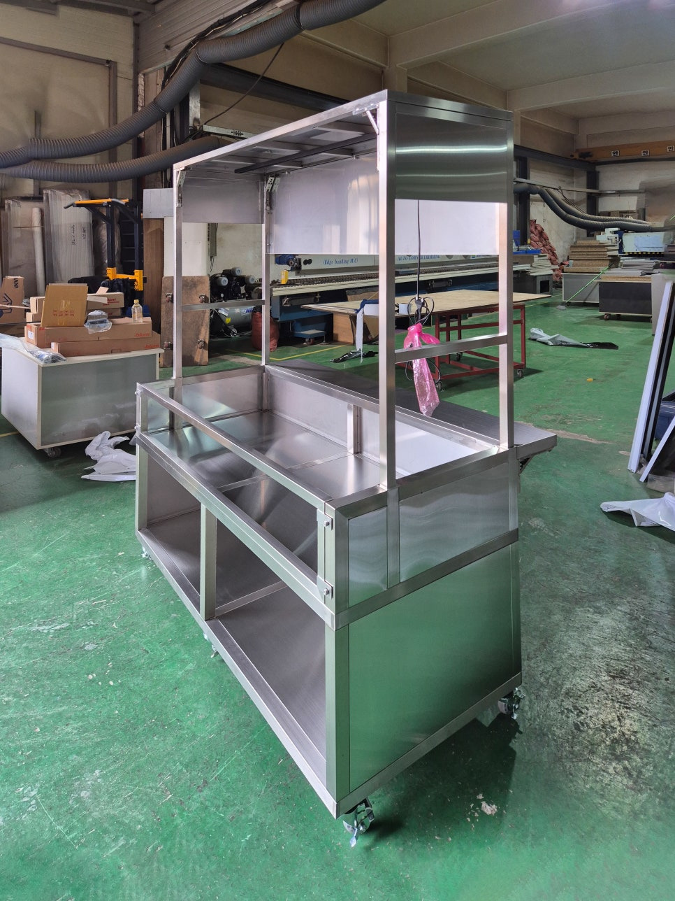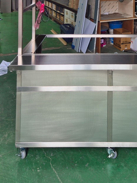 안녕하세요, 동서스텐입니다 :) 이번에 소개해드릴 제작 사례는 실내외 팝업스토어에서 활용하기 위한 이동식 호떡 판매대입니다. 이동성과 기능성을 모두 고려한 맞춤형 제작 의뢰로, 제품 특성상 차량 적재가 용이하고 다양한 환경에 유연하게 대응할 수 있는 구조가 요구되었습니다. 고객님께서는 전기식 호떡 그릴 수납부터 고객 응대를 위한 접이식 선반 설치, 높이 제한 등 세세한 조건들을 제시해 주셨으며, 저희는 이를 충실히 반영하여 제작을 진행하였습니다.