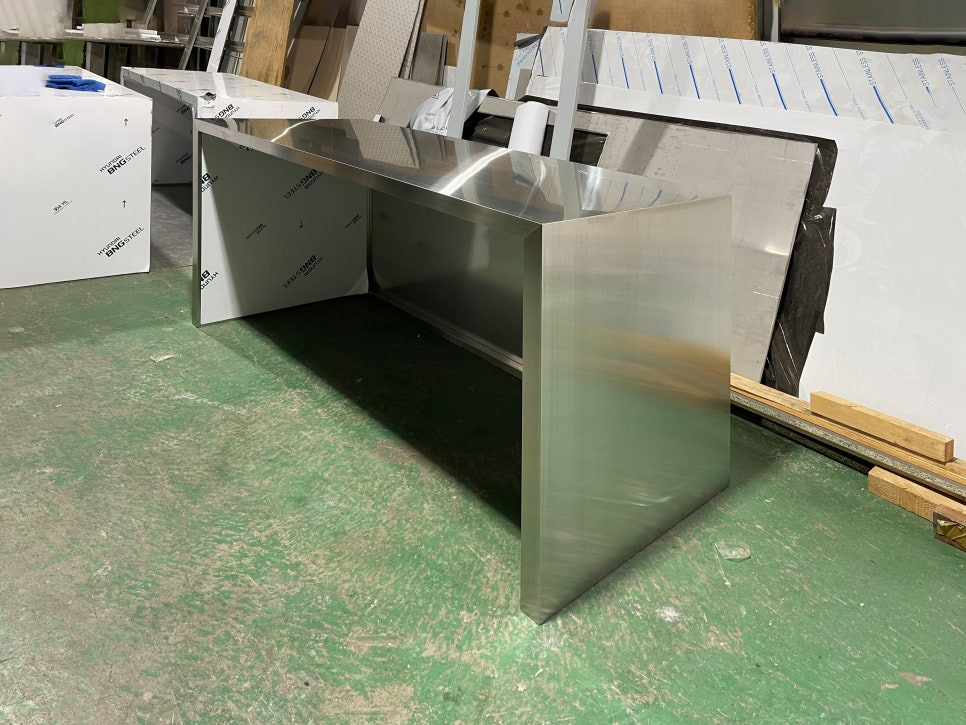 이번 테이블 제작에서는 STS 304 HL 1.2T 소재를 사용했습니다. STS 304는 고급스러운 광택과 내구성으로 널리 사랑받는 스테인리스 소재로, 특히 HL(헤어라인) 마감은 표면에 은은한 결을 더해 세련되면서도 차분한 분위기를 연출합니다. 원래 일체형테이블은 바이브레이션 마감으로 제작하는 경우가 많지만, 이번에는 고객사의 특별한 요청에 따라 헤어라인 마감을 적용해 차별화된 디자인을 구현했습니다. 이 과정에서 상판과 측판의 만나는 부분, 그리고 테이블의 전면부까지 모두 동일한 헤어라인 결이 자연스럽게 이어지도록 디테일한 가공에 특히 신경을 썼습니다.