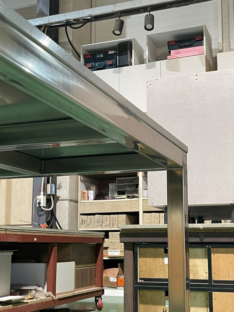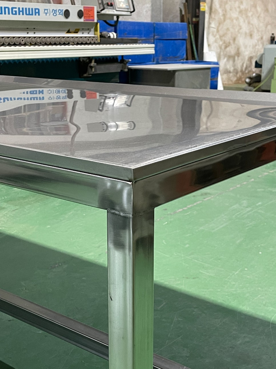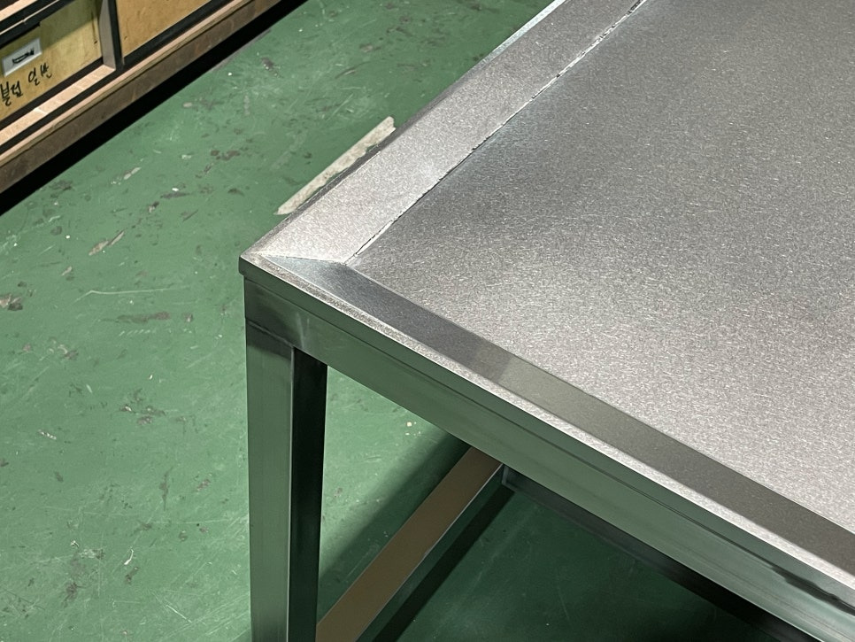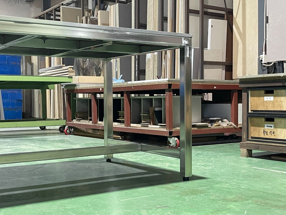 요청에 맞춰 상판은 STS 304 H/L 1.2T로 구성하였습니다. 물류창고 작업대는 상판에 박스가 쌓이고 끌리고 미끄러지는 상황이 많아 스크래치나 마모가 자연스럽게 발생할 수밖에 없는데 헤어라인 마감은 결 방향이 있어 작업 흔적이 상대적으로 덜 거슬리고 관리도 수월한 편입니다. 또한 스테인리스 작업대 특성상 오염이 묻어도 닦임이 좋아 우편집중국처럼 작업량이 많은 장소에서 실사용 만족도가 높은 구성이었습니다.