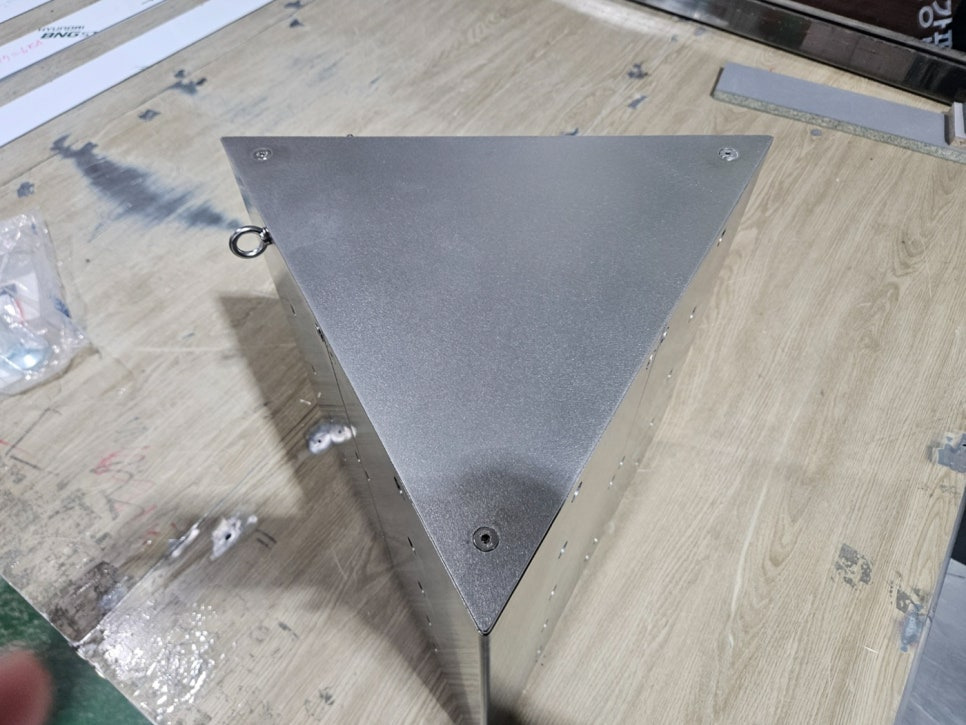 먼저, 골조는 40각 스테인리스 파이프를 사용하여 기본 틀을 잡았고, 여기에 삼각형으로 절곡한 STS 304 VIB 3T 판재를 정밀하게 체결했습니다. 단순히 고정하는 것이 아니라, 피스 체결 시 구조 간 벌어짐이 발생하지 않도록 각 판재의 각도와 접합 위치를 세심하게 조율하였으며, 마감에서도 매끄러운 실루엣을 구현했습니다.